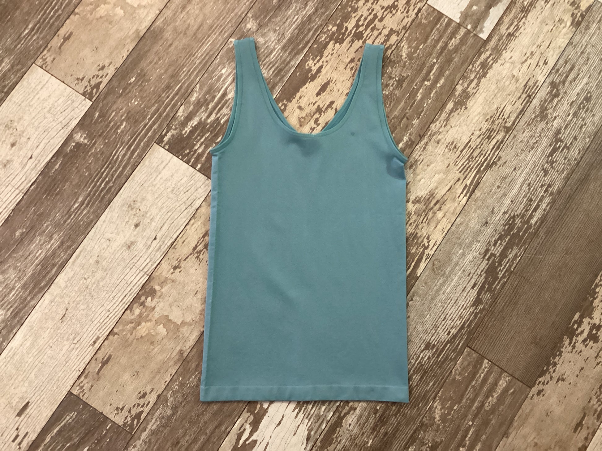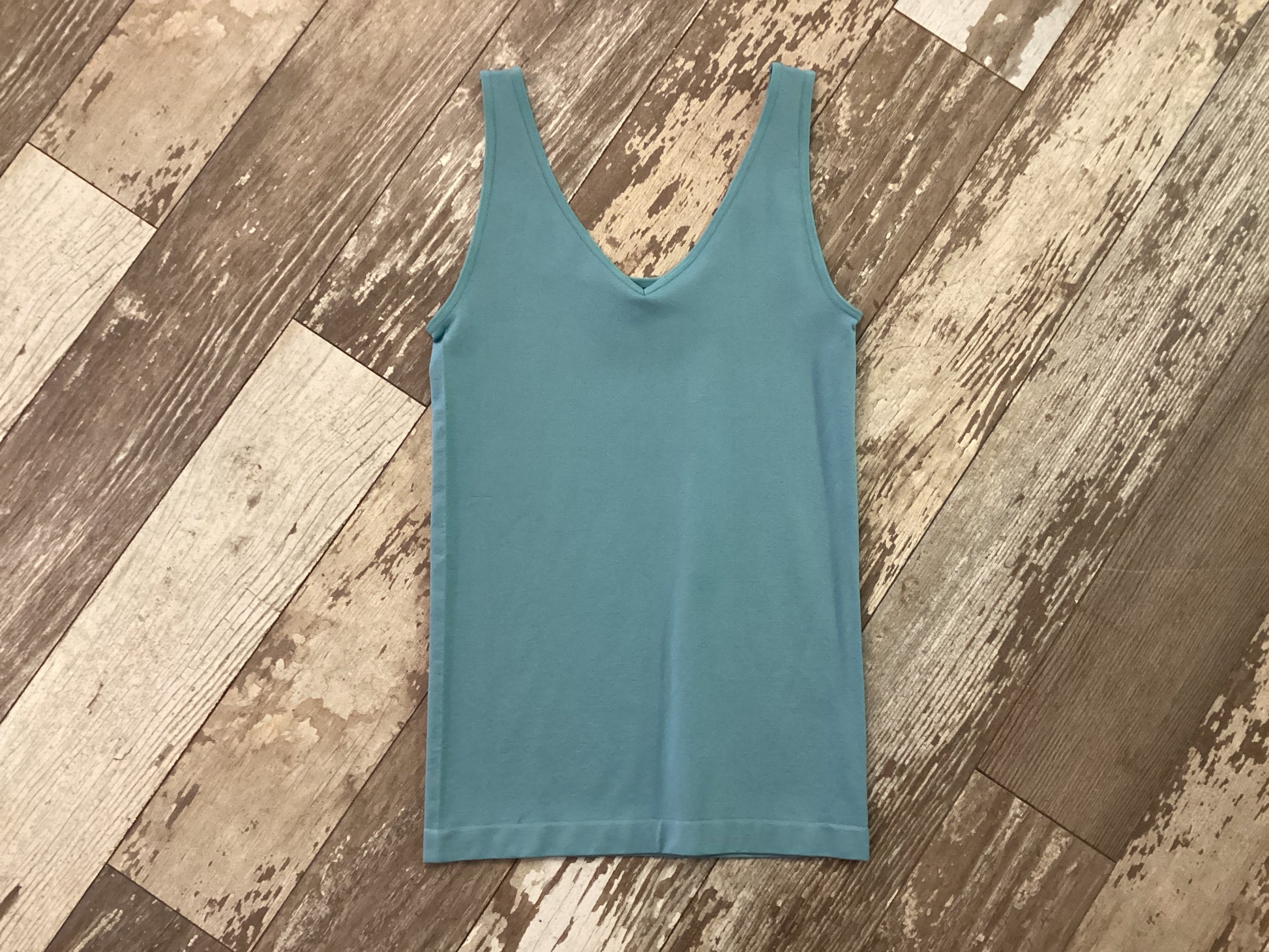 This dusty teal tank top offers both v-neck and u-neck options, making it a versatile addition to your wardrobe. The seamless design provides a comfortable fit, perfect for layering or wearing on its own. Stay stylish and comfortable with this 2-way tank top.