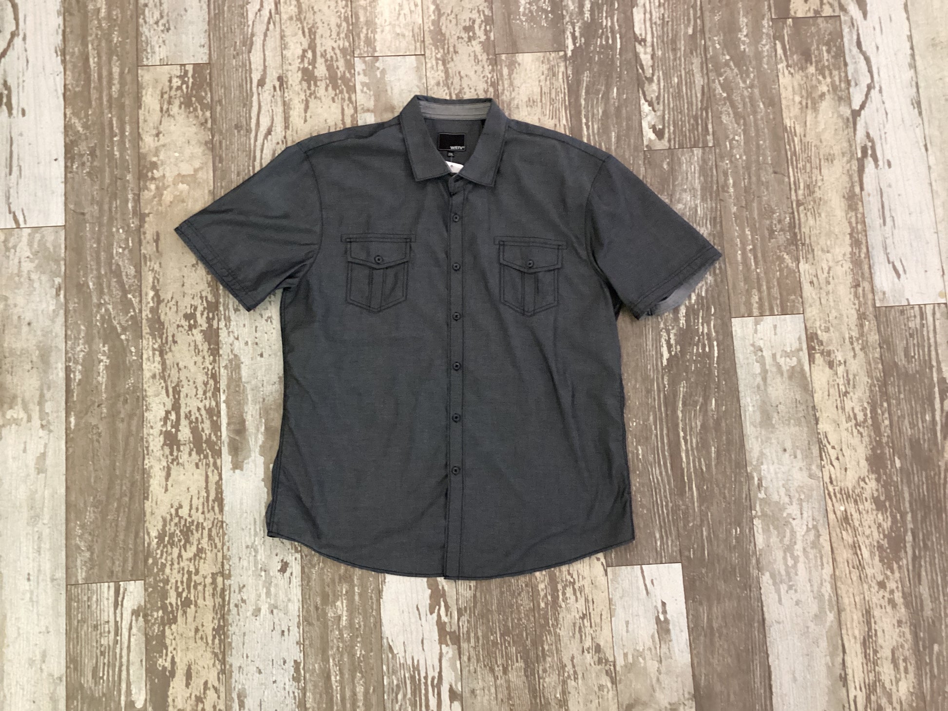 Picture yourself in this new short sleeve button down! Light weight, heather black with a grey detail on the rolled sleeve will take you from a casual day to a night on the town!