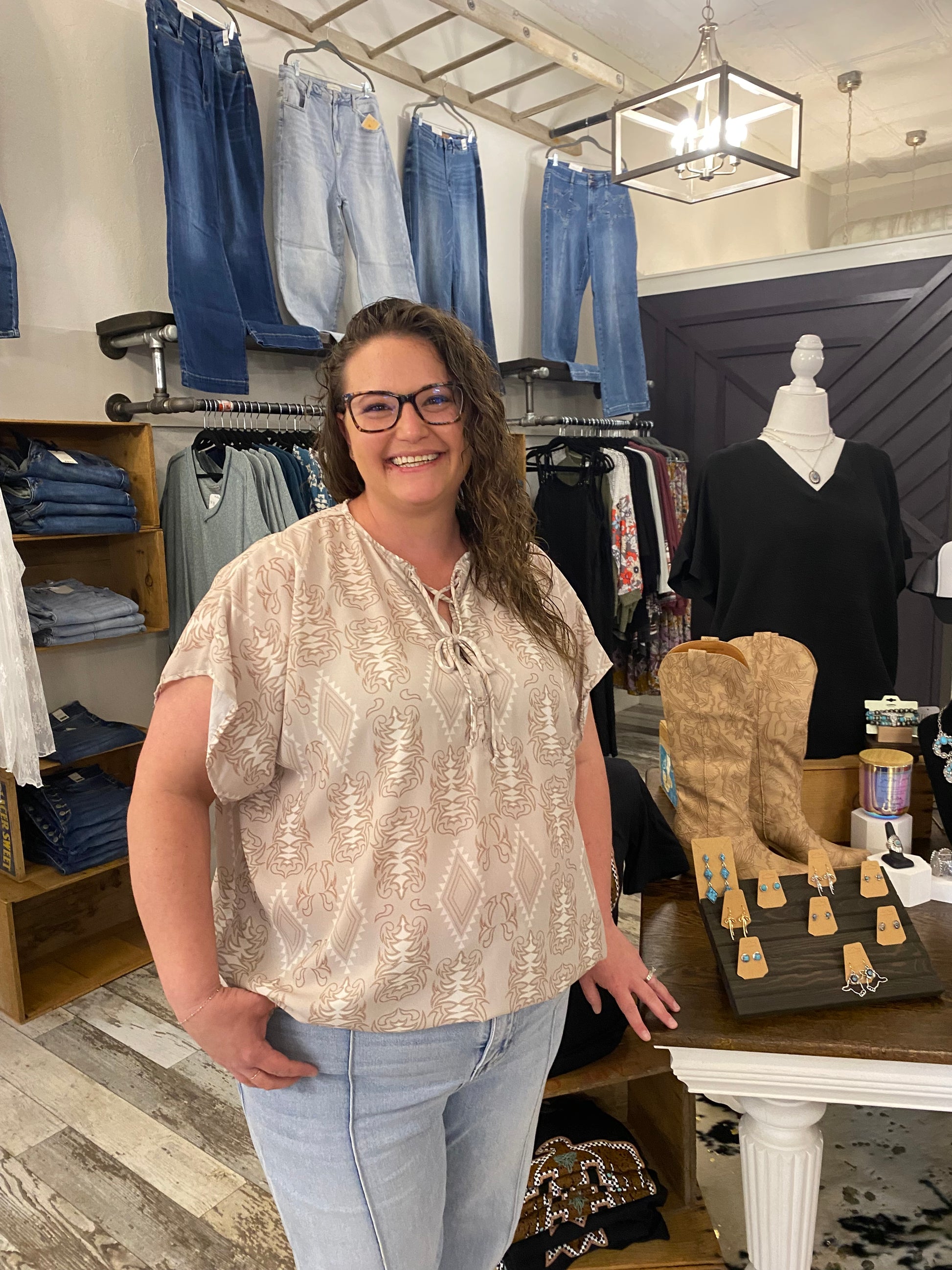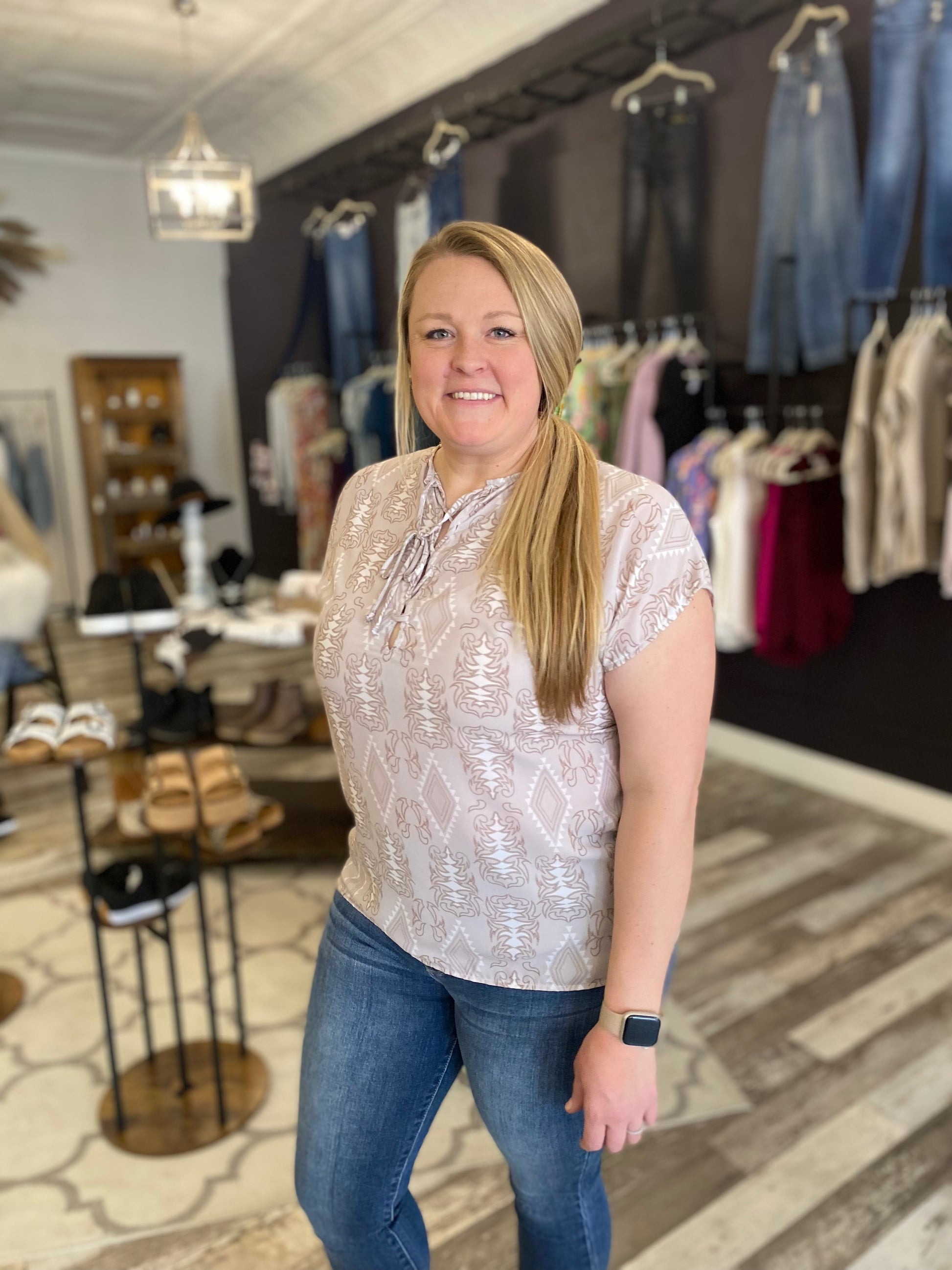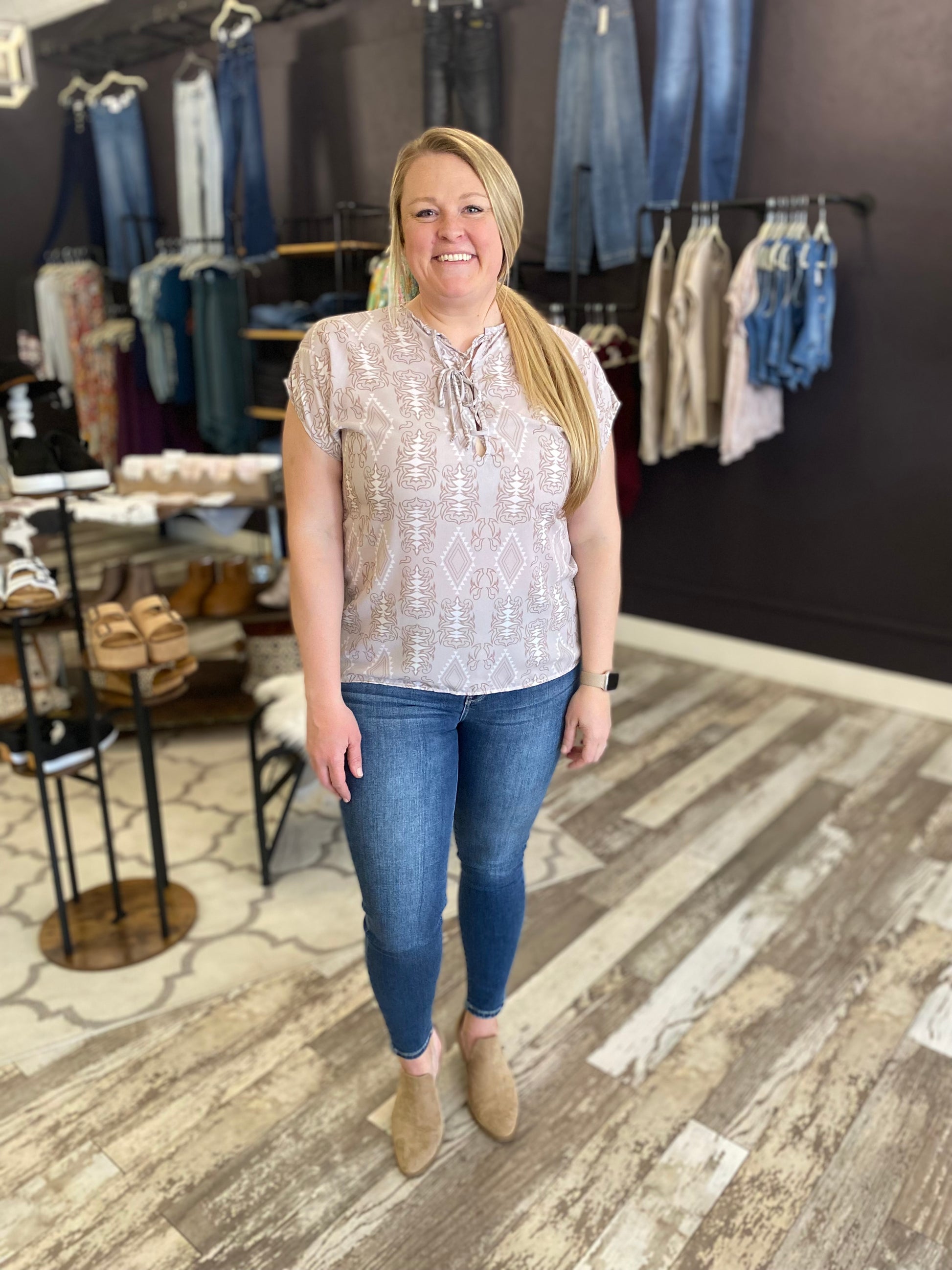 Expertly crafted with a beautiful boot stitch design, our Boot Stitch Top in beige is both stylish and comfortable. The light-weight, flowy fabric adds a touch of elegance, while the self front tie allows for a flattering fit. Perfect for any occasion, this top is a must-have for your wardrobe.