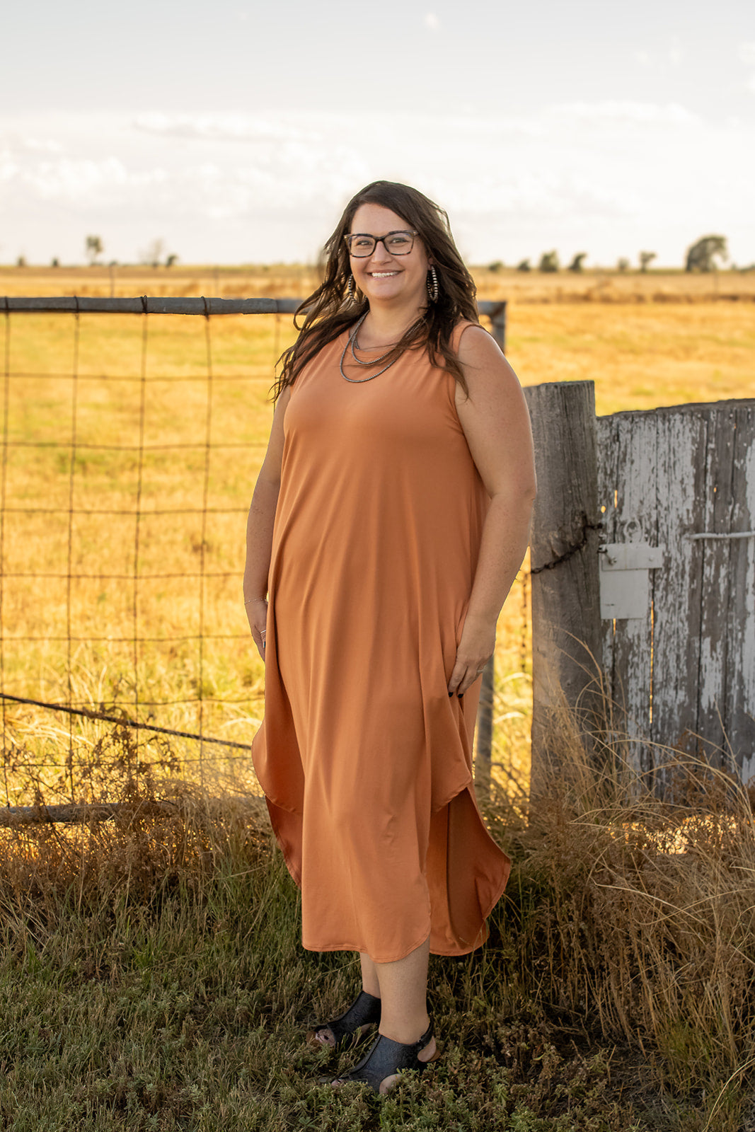 This plus-size brushed dress in burnt orange features a soft fabric that ensures all-day comfort. Designed with a rounded neck and practical side slits, it offers ease of movement and a flattering fit. Convenient pockets add functionality without compromising style, making it a versatile choice for both casual and polished looks.