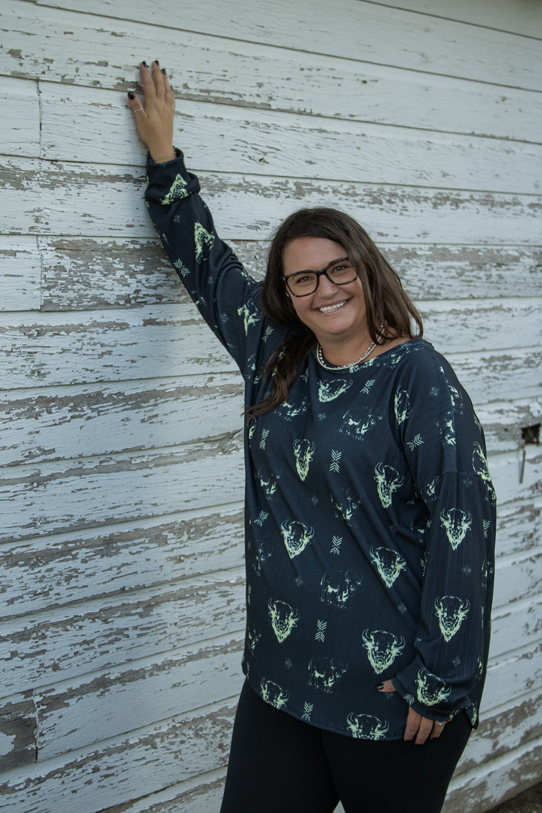 This Buffalo Printed Long Sleeve top features a classic black base with a distinctive buffalo print, offering a stylish yet timeless look. Crafted with a ribbed texture, it provides a comfortable fit and subtle stretch. The round neckline enhances versatility, making it suitable for layering or wearing alone. Ideal for those seeking a blend of pattern and comfort in their wardrobe essentials.