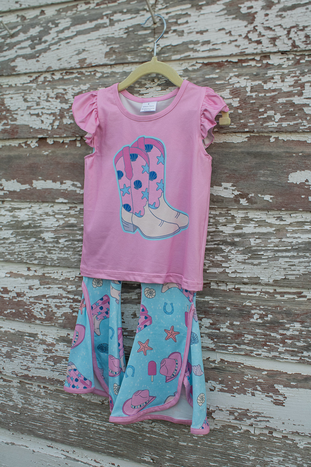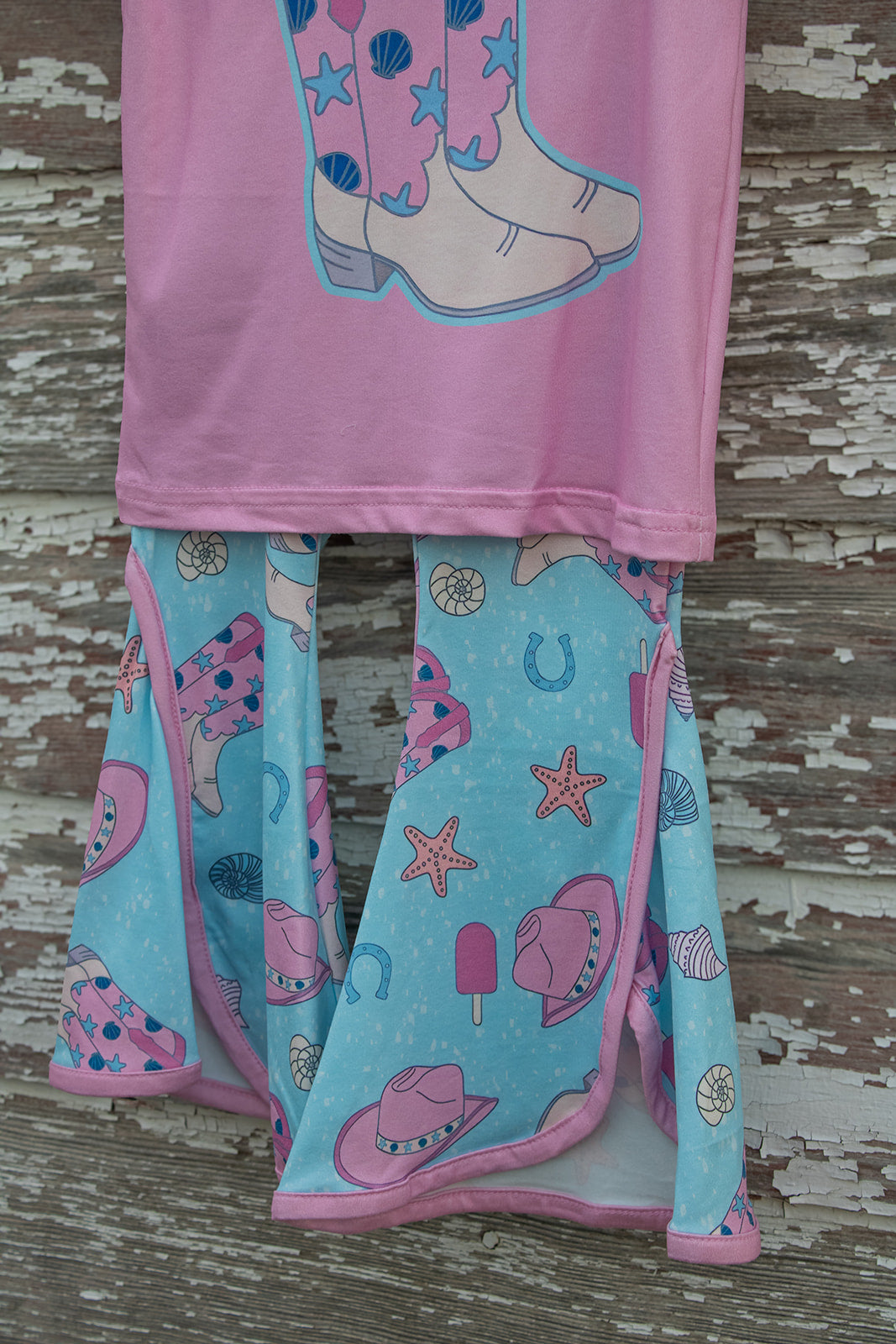 This girl's western printed 2-piece set includes a pink angle sleeve cowgirl boot top and blue pants with western print. Perfect for any cowgirl-in-training, this stylish set offers both comfort and country charm.