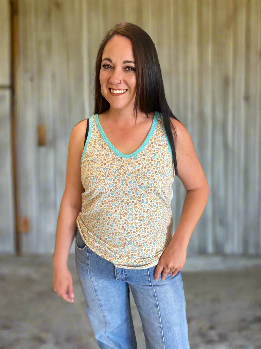 Floral tank top featuring a scoop neckline, contrast along neckline, curved hem, and sleeveless. A flowery tank top So soft and comfortable