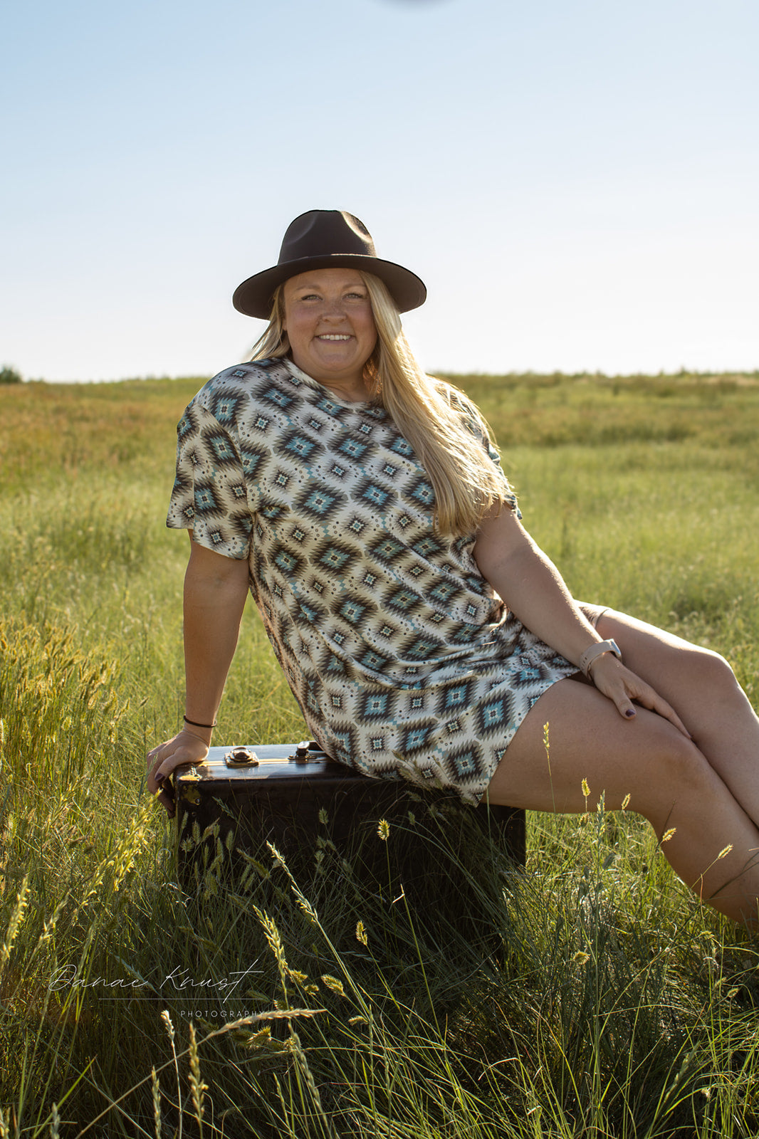 The In the Wild Dress is a versatile addition to your wardrobe. Featuring a T-shirt short sleeve design and round neck, this dress showcases a beautiful Ivory light blue Aztec pattern. Made with soft and comfortable materials, it brings a touch of western charm to any outfit.
