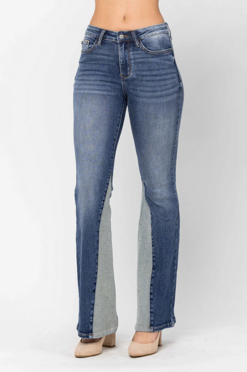 Step into timeless style with the Judy Blue Midrise Inseam Panel Flare Jeans (Style 88524). Crafted from a premium blend of 94% cotton, 5% polyester, and 1% spandex, these jeans offer a comfortable fit with a hint of stretch for all-day wear. The midrise design, with a rise of 10", flatters your figure while providing a relaxed fit through the hips.