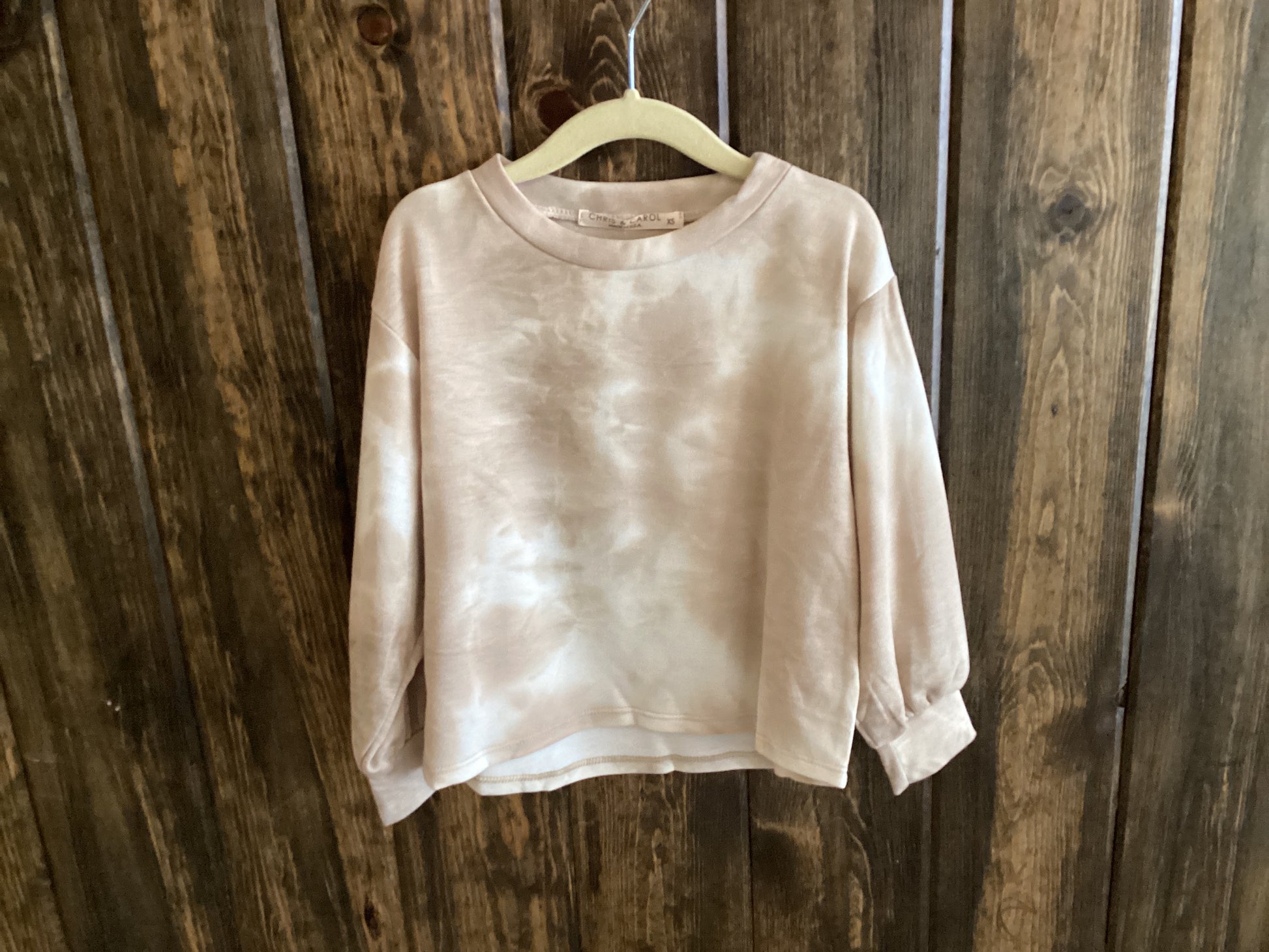 Made of a soft and comfortable french terry fabric, this tan and cream tie dye top will soon be your littles favorite go to!