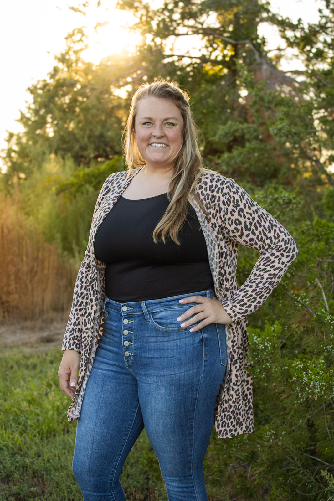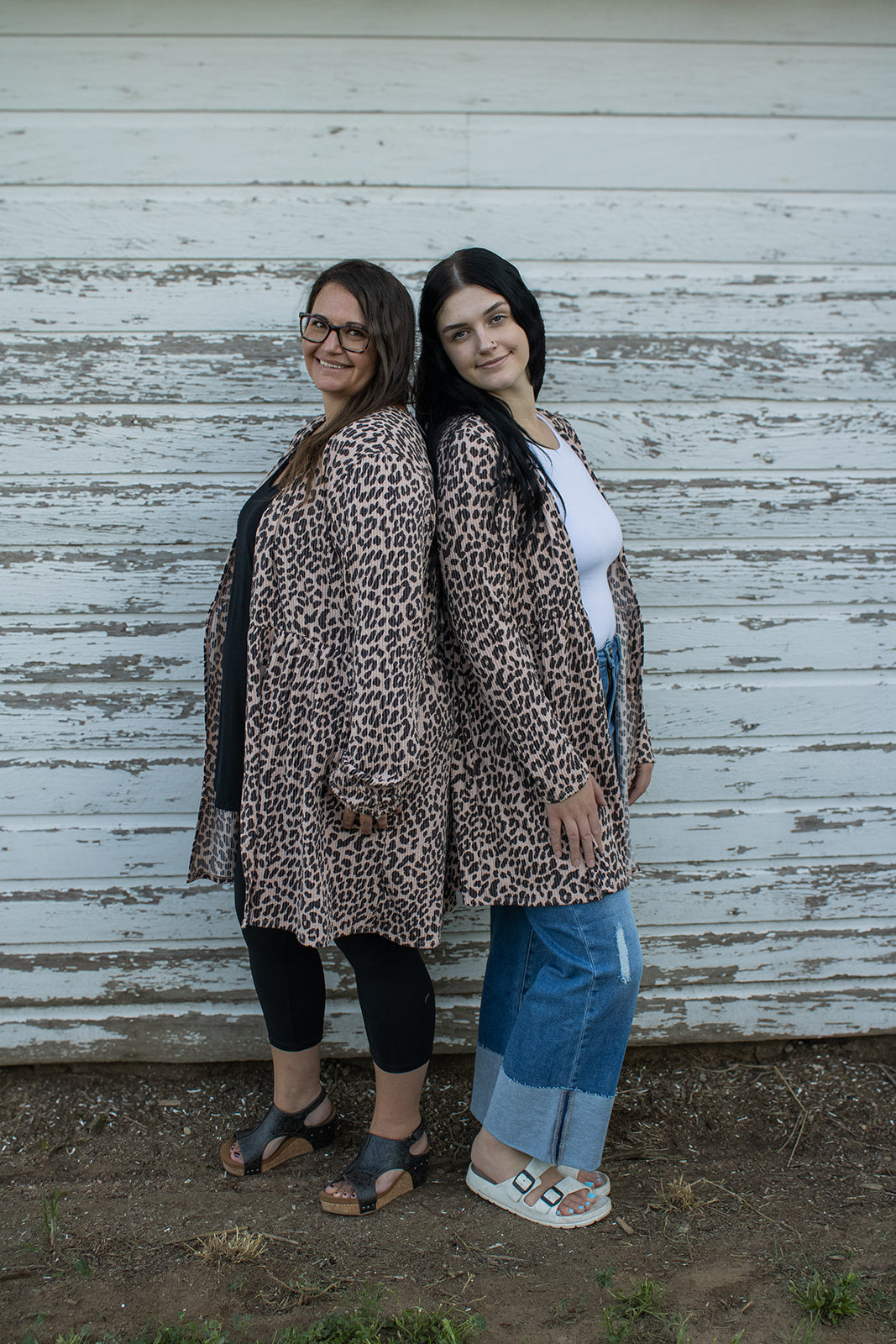 This leopard print cardigan features a striking pink base color accented with bold black leopard spots, combining vibrant style with classic animal print appeal. Designed with practical side pockets, it offers convenient storage while maintaining a sleek silhouette. Ideal for layering, this cardigan adds a fashionable edge to any outfit with both comfort and functionality.
