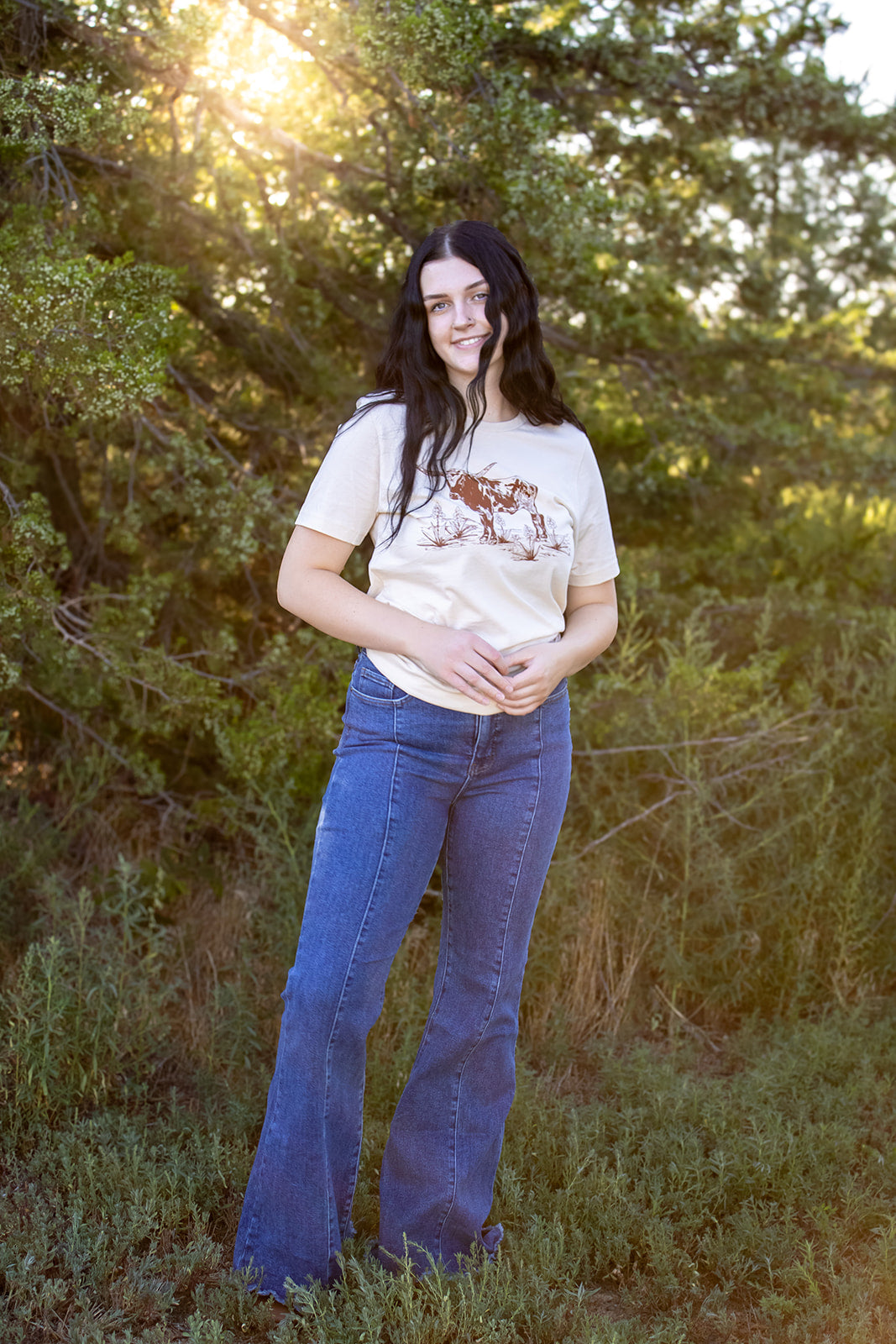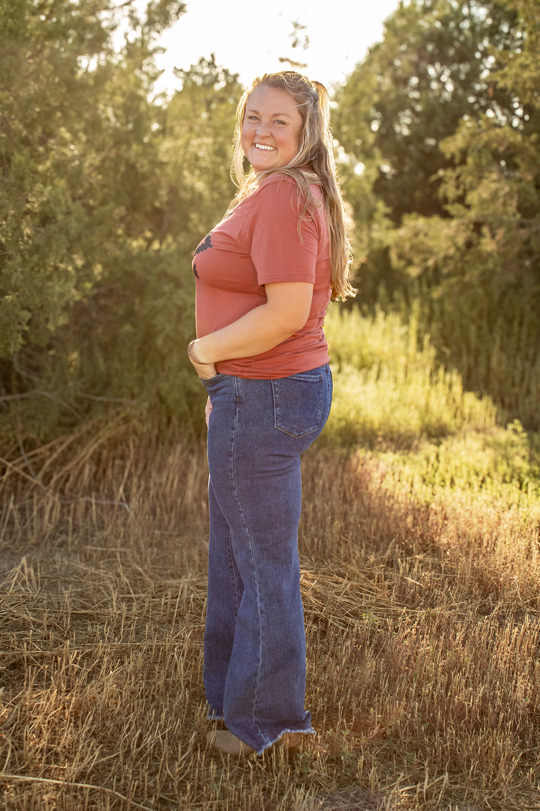 Denim full-length wide-leg flare jeans with raw hem, five pockets, and a comfortable, adjustable waistband that eliminates gaps in your waistline-featuring a curved bake yoke that enhances the shape of your backside and is made from super soft, stretchy fabric for ultimate comfort.