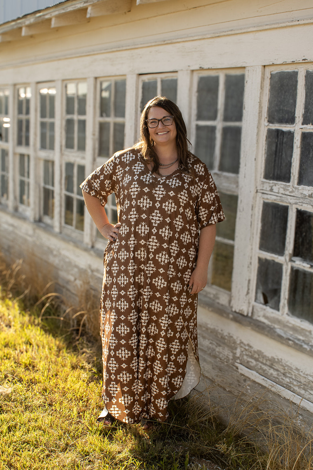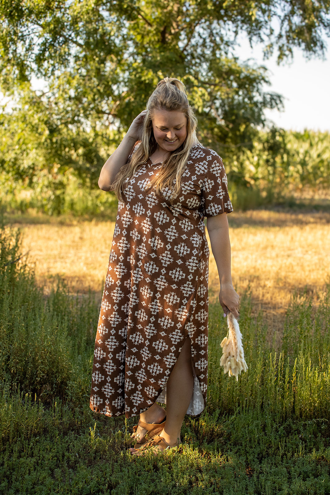 Step into effortless style with the Meet Me In Wyoming Maxi Dress. This brown maxi features a charming cream-colored Aztec print that adds a playful touch to your wardrobe. Perfect for sunny days or breezy evenings, its flowing silhouette keeps you comfortable while turning heads wherever you go. Embrace a fun, free-spirited vibe with this standout dress!