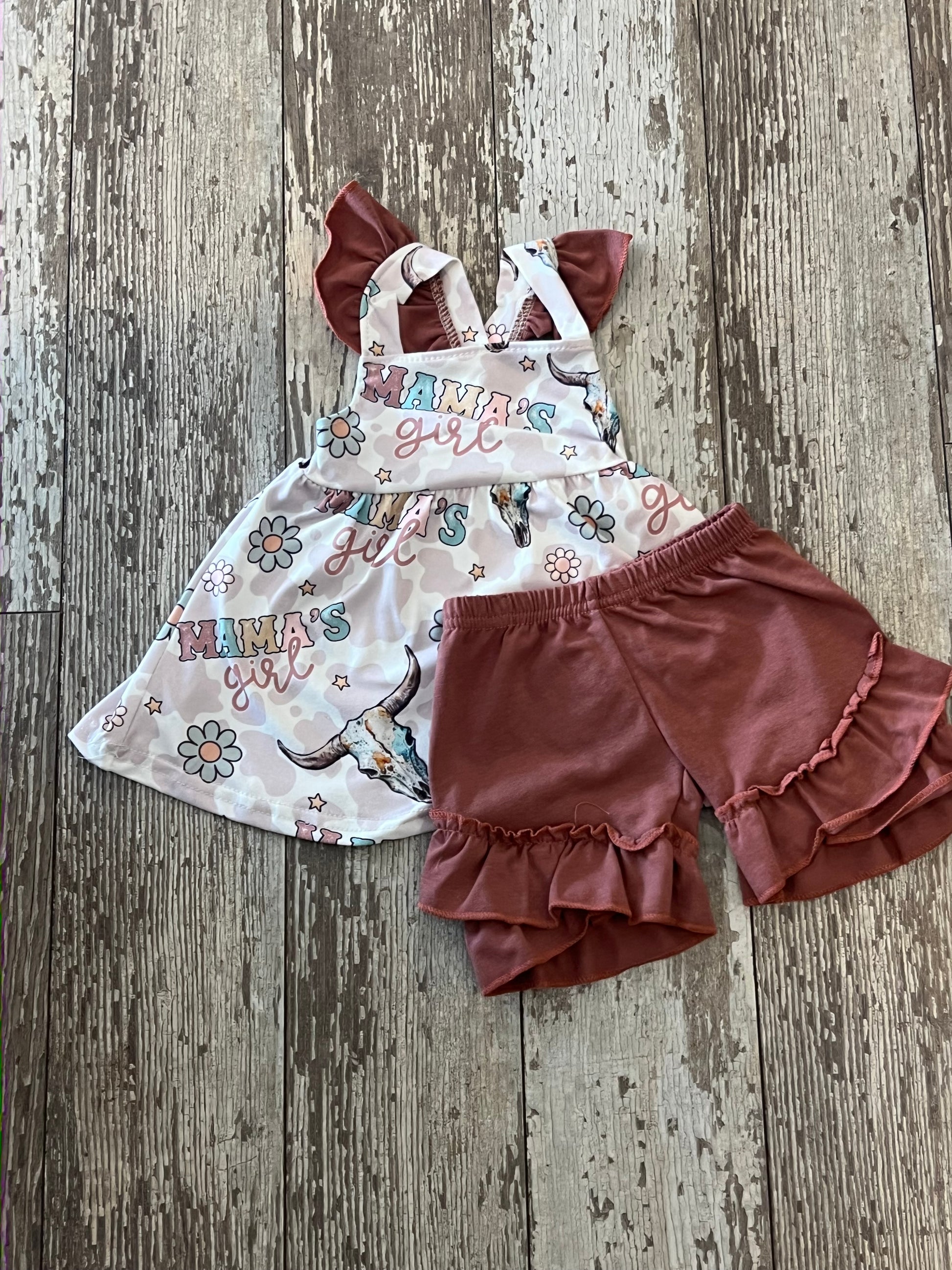 Elevate your little one's western-inspired wardrobe with our Momma's Girl Cowgirl Set. This distinctive ensemble features a purple cow print shirt adorned with skull accents, perfectly paired with rich maroon shorts. Expertly designed for comfort and style, this set delivers authentic cowgirl flair while maintaining practical wearability for active children.