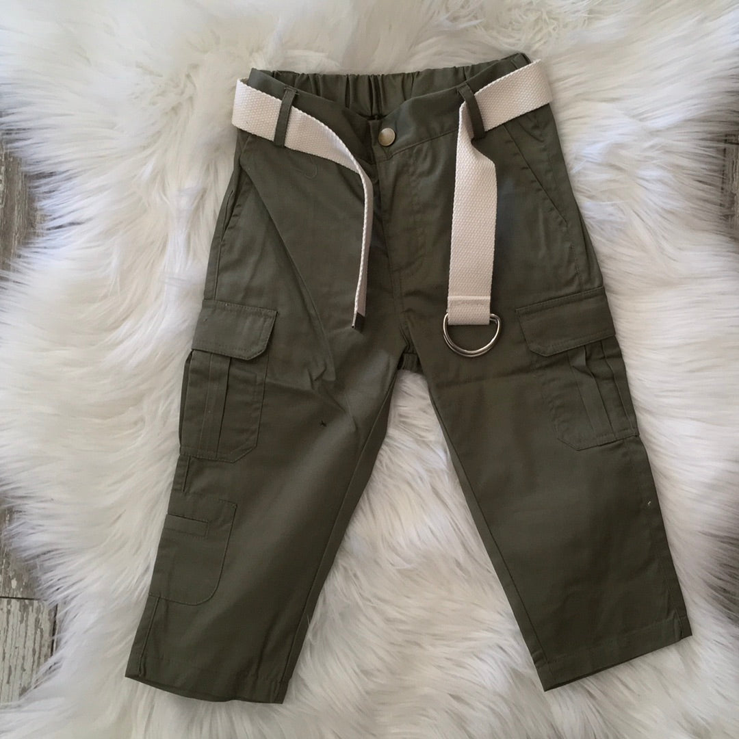 Cargo pants are in! These cargo pants are olive green with a white belt. These pants would look great on your little girl or little boy! We know you both will love them!