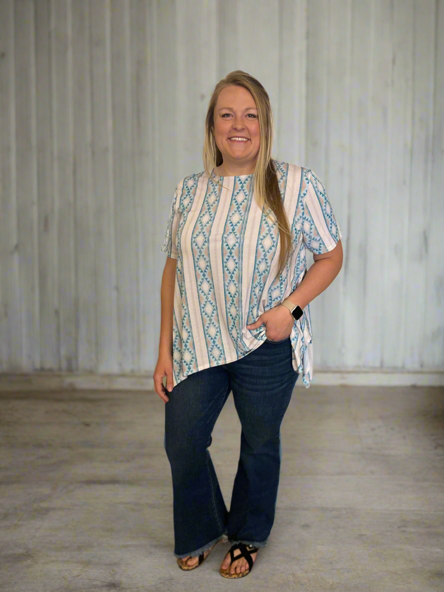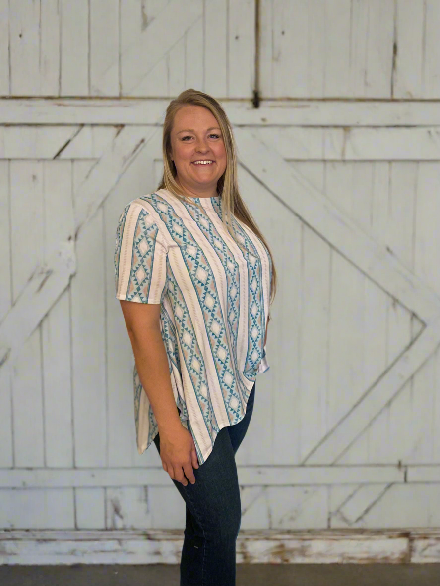 Experience comfort and style with the Out West Blouse (Plus). Featuring short sleeves and a loose-flowing design, this top is perfect for any occasion. The shark bite hem adds a unique touch, while the Ivory and turquoise color combination adds a pop of color to your wardrobe. Look and feel your best with this elegant and versatile blouse.