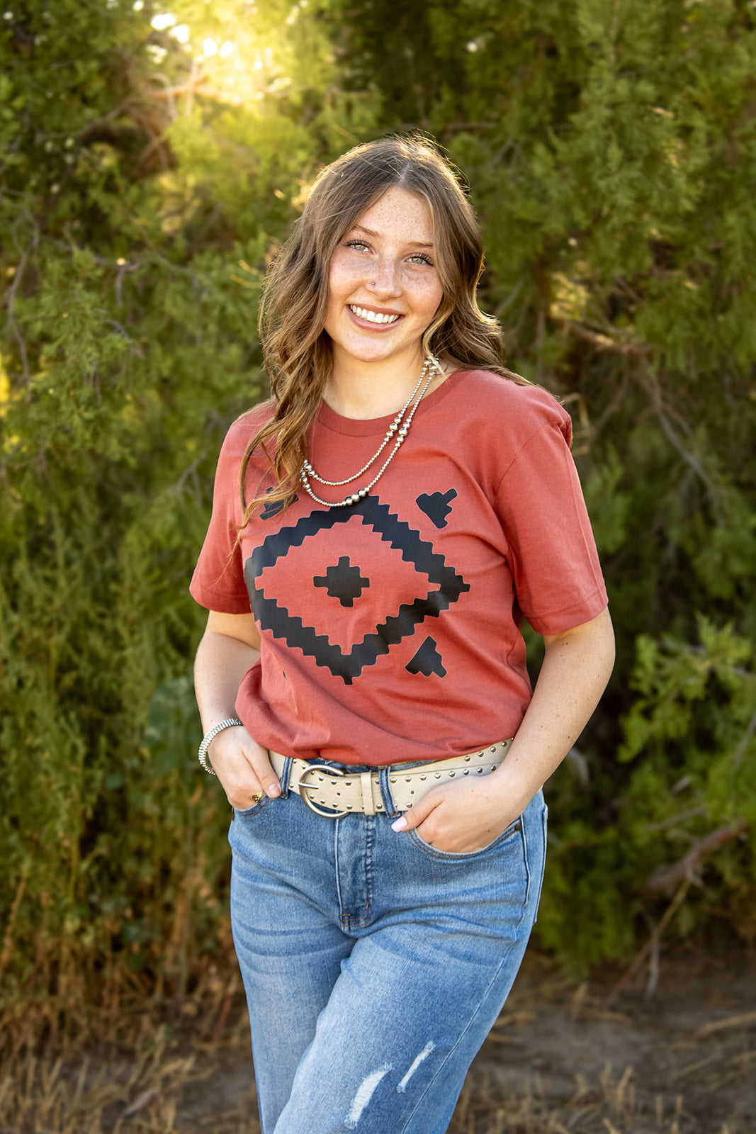 Experience the Rust Aztec Tee, crafted for softness and versatility. Its gentle fabric feels comfortable against the skin, making it ideal to wear alone or layered with mesh, cardigans, or jackets. Designed in a warm fall color palette, this tee seamlessly blends style and function for seasonal layering.