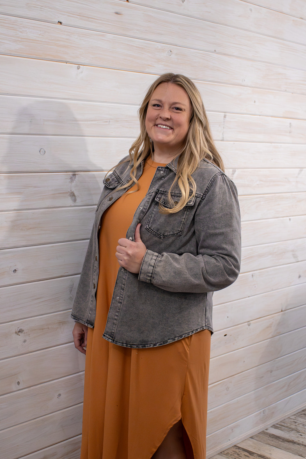This rustic silver gray denim jacket is perfect for s’mores around the campfire or football games on chilly fall nights - cozy and comfy.