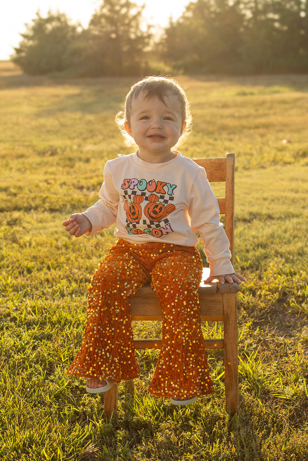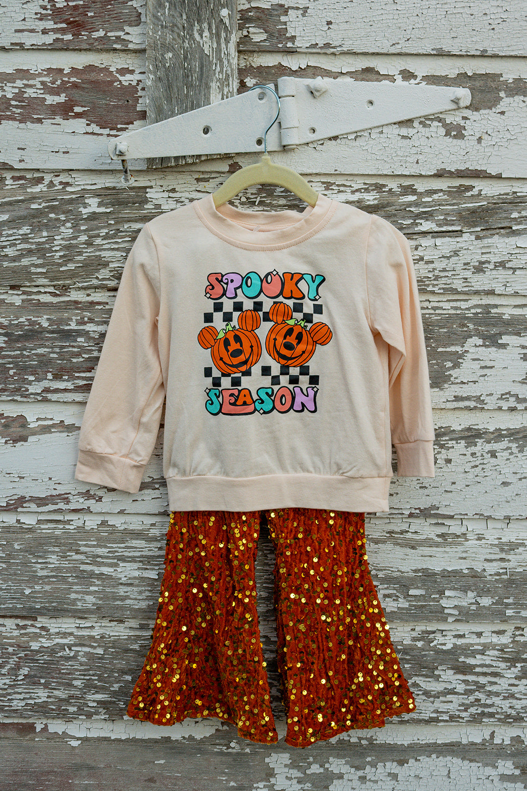 This Spooky Season Set features a charming Mickey and Minnie Mouse cream long sleeve top paired with vibrant orange sparkly flare pants. Designed for little girls, this outfit combines playful character appeal with festive fall colors and a touch of sparkle, making it perfect for seasonal celebrations and everyday wear during cooler months. The long sleeves provide warmth, while the flare pants add a fun, stylish silhouette that moves with ease.