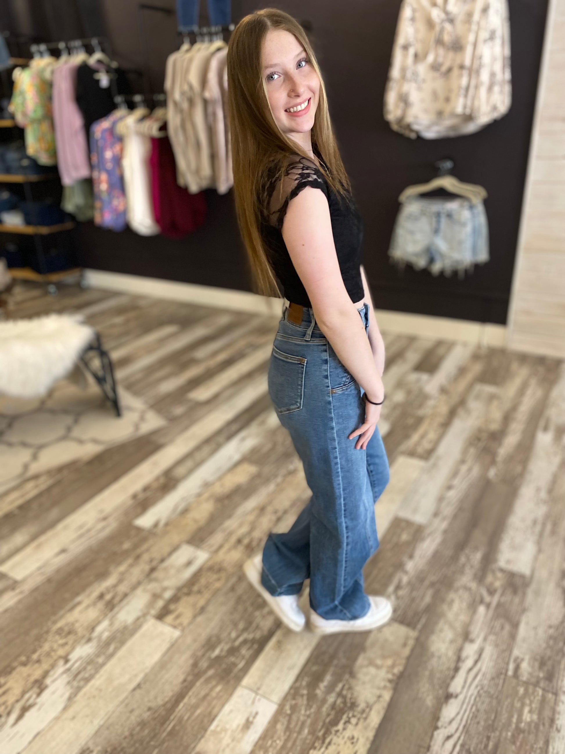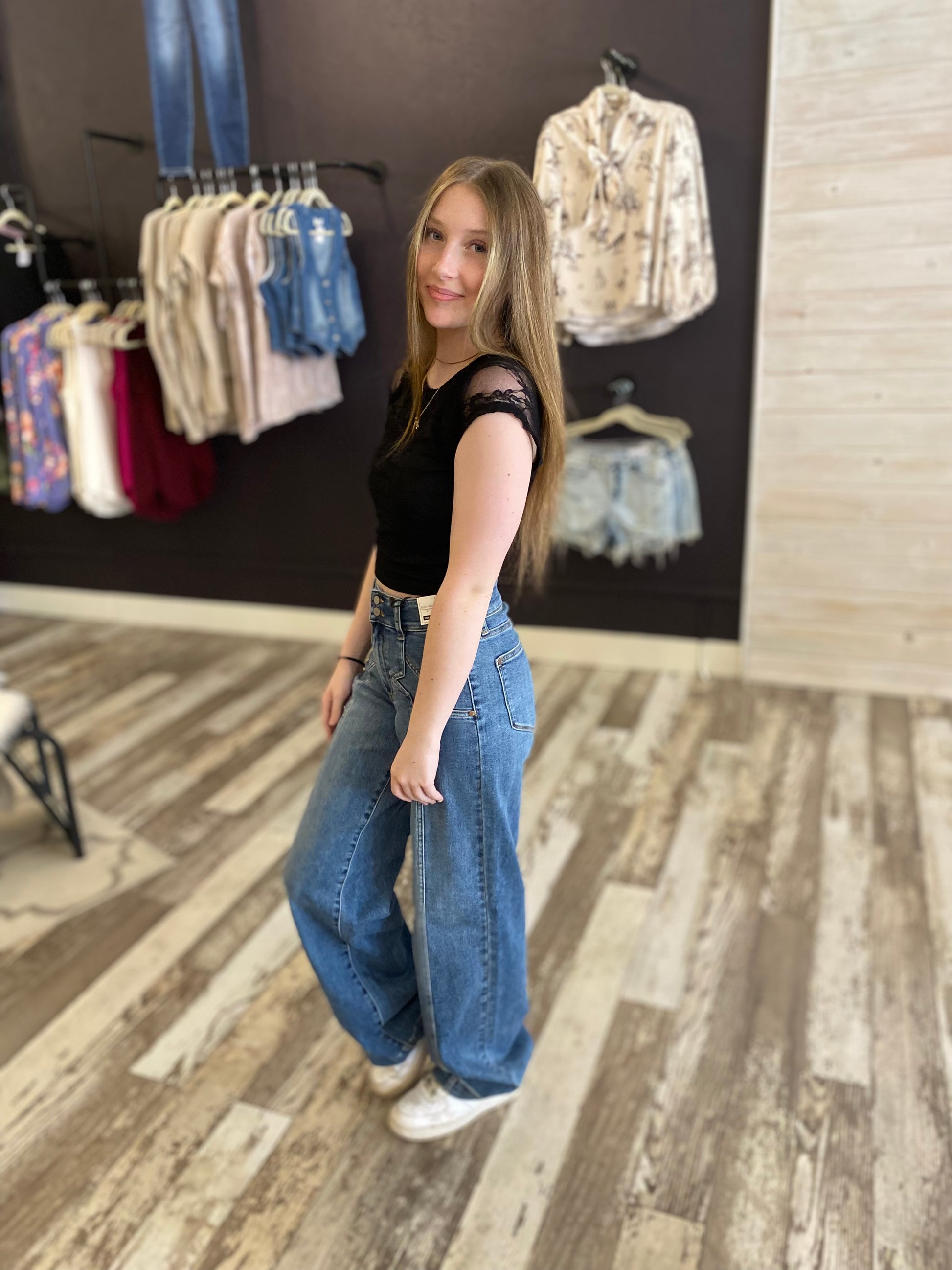 Expertly designed with a medium wash and wide legged fit, this pair of jeans adds a touch of unique style with its star detailing. Crafted with comfort in mind and made with stretchy material, these jeans offer both fashion and function for everyday wear.