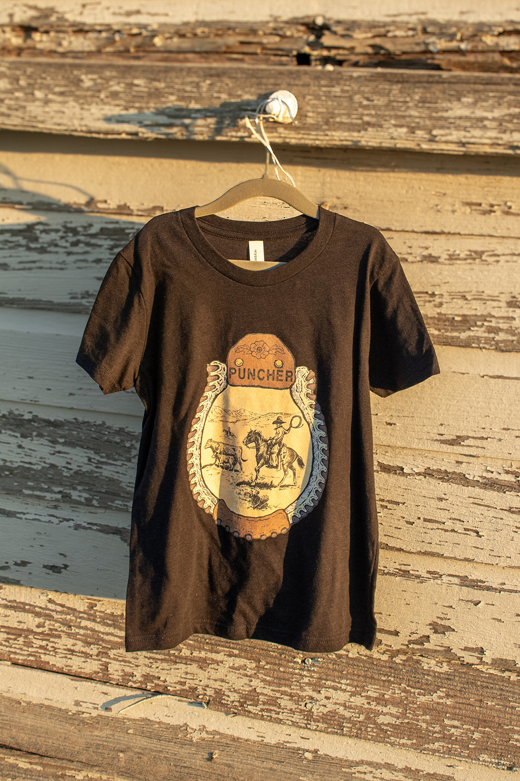 This black tee is perfect for your young cowboy or cowgirl with BIG ranch dreams. It features a hand-drawn graphic of a cowboy riding his horse, following a momma cow and her calf across the open country framed with a stirrup wrapped in leather. With "Puncher" proudly printed front and center, this tee is all about raising 'em right - tough and true, and ready to ride.