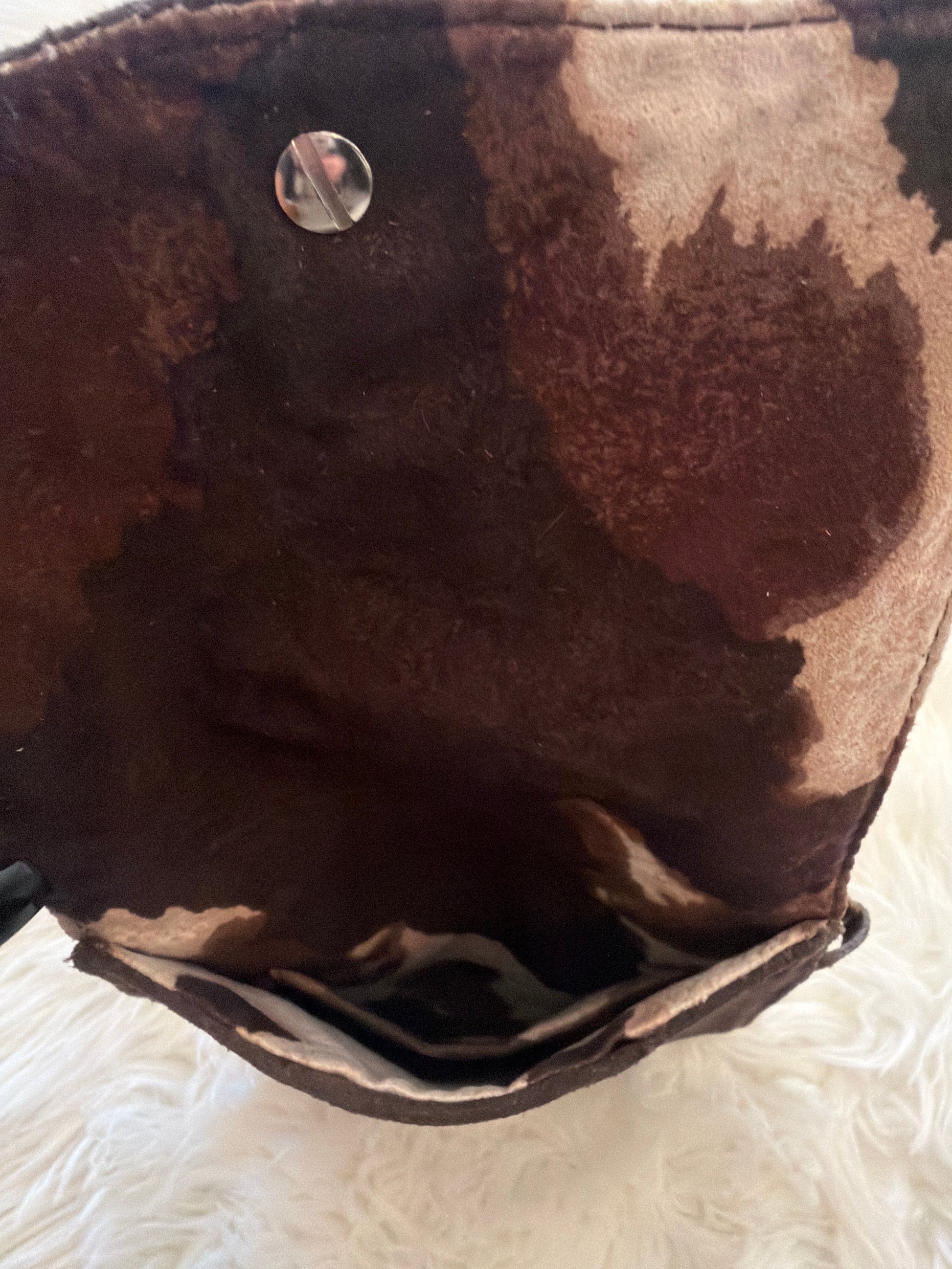 The Trail Rider small crossbody merges artisanal craftsmanship with understated elegance. Handcrafted by a local artist, this compact bag features supple leather exterior paired with a distinctive cowhide print fabric lining. A practical interior pocket keeps essentials organized, while a textured cow hair exterior pocket adds visual interest and tactile appeal. The soft leather strap ensures comfortable, customizable wear for any occasion. A refined accessory that celebrates quality materials and thoughtful design.